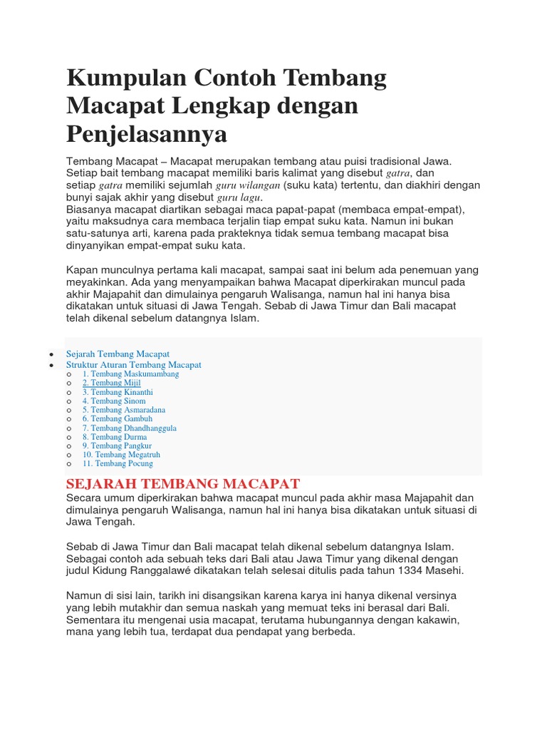 Salah sawijine geguritan jawa sing kerep awake dhewe rungokake yaiku tembang macapat, sing minangka pametu cipta sastra jawa anyar sing nggunakake basa jawa anyar (saputra, 2010: Gatekna tembang macapat gambuh iki! Pangerten watak paugeran / pathokan makna teks asli 4. Miturut ukura liyane, tembang macapat yaiku minangka wujud geguritan jawa sing migunakake bahasa jawa anyar, tinalenan karo paugeran guru gatra, guru wilangan. Dari sebelas macam tembang macapat memiliki paugeran yang berbeda beda dari setiap judulnya.